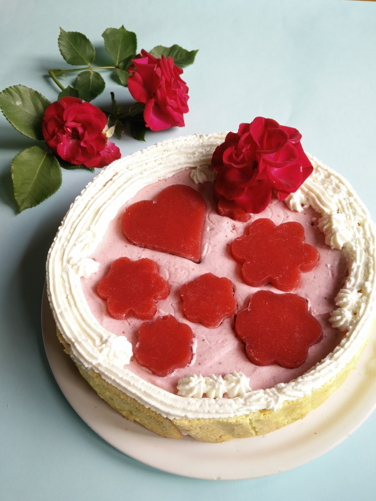 Inumidire con la bagna il Pan di Spagna poi distribuire sul fondo i pezzetti di fragole. Versare all’interno la panna alle fragole e livellate il composto in superficie. Mettere in frigo per mezz’ora poi procedere alla decorazione. Rimettere in frigo per altre due ore prima di servire.