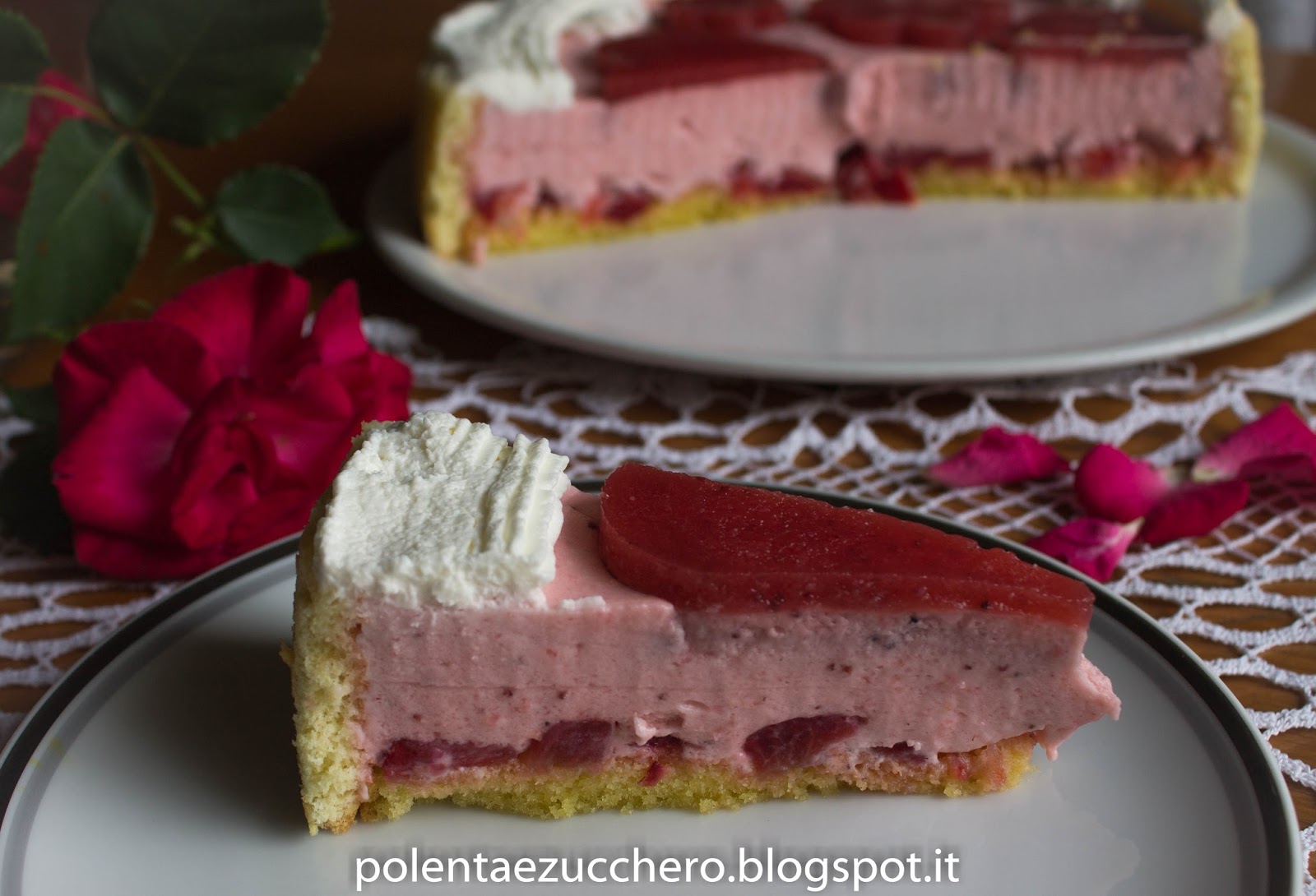 Mettere in acqua fredda i fogli di colla. Frullare 500 gr di fragole con lo zucchero a velo. Scaldare in un pentolino il vino bianco e sciogliervi la cotta ammorbidita tolta dall’acqua e ben strizzata. Mescolare bene poi aggiungere le fragole frullate. Tagliare a pezzettini gli altri 200 gr di fragole. Montare la panna poi incorporare piano piano con una spatola la purea di fragole tenendone eventualmente tre cucchiai da parte per decorare la superficie del dolce, amalgamare bene la crema.