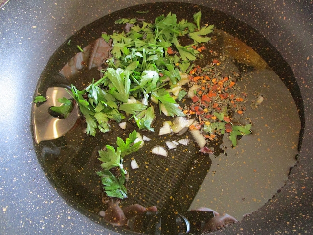 - in una larga padella preparare il soffritto con lo spicchio d’aglio tritato finissimo , il prezzemolo e il peperoncino con l’olio extravergine d’oliva