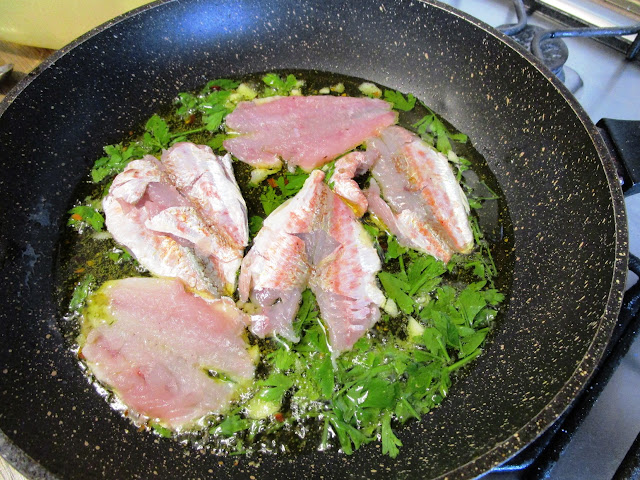 - aggiungere i filetti di triglie e rosolare a fuoco basso, mescolando delicatamente per 3 minuti