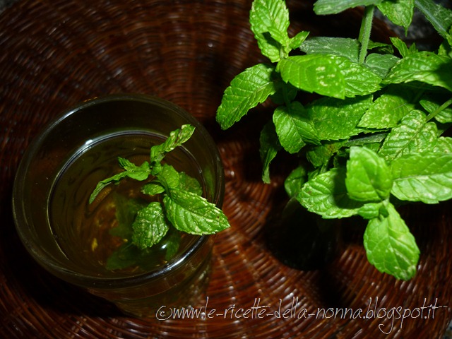 Conservare al fresco in frigorifero e servire la bevanda fredda, guarnendo con un rametto di menta fresca.
