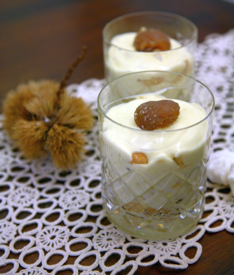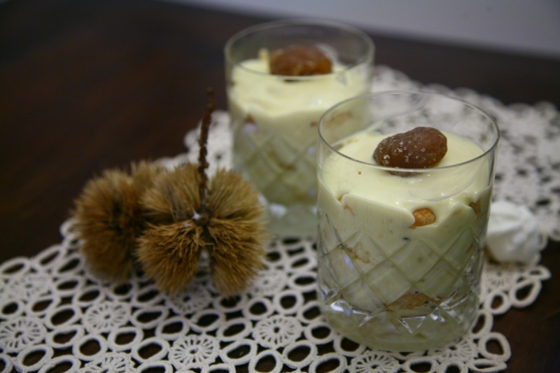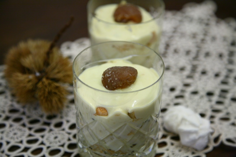 Prendere il bicchiere e mettere sul fondo un cucchiaio di crema, i savoiardi imbevuti lella bagna al limone, aggiungere la crema, sbriciolare un po’ di meringa e completare con qualche pezzo di marron glacé. Procedere con il secondo strato mettendo i savoiardi imbevuti, la crema e terminare con i marron glacé.