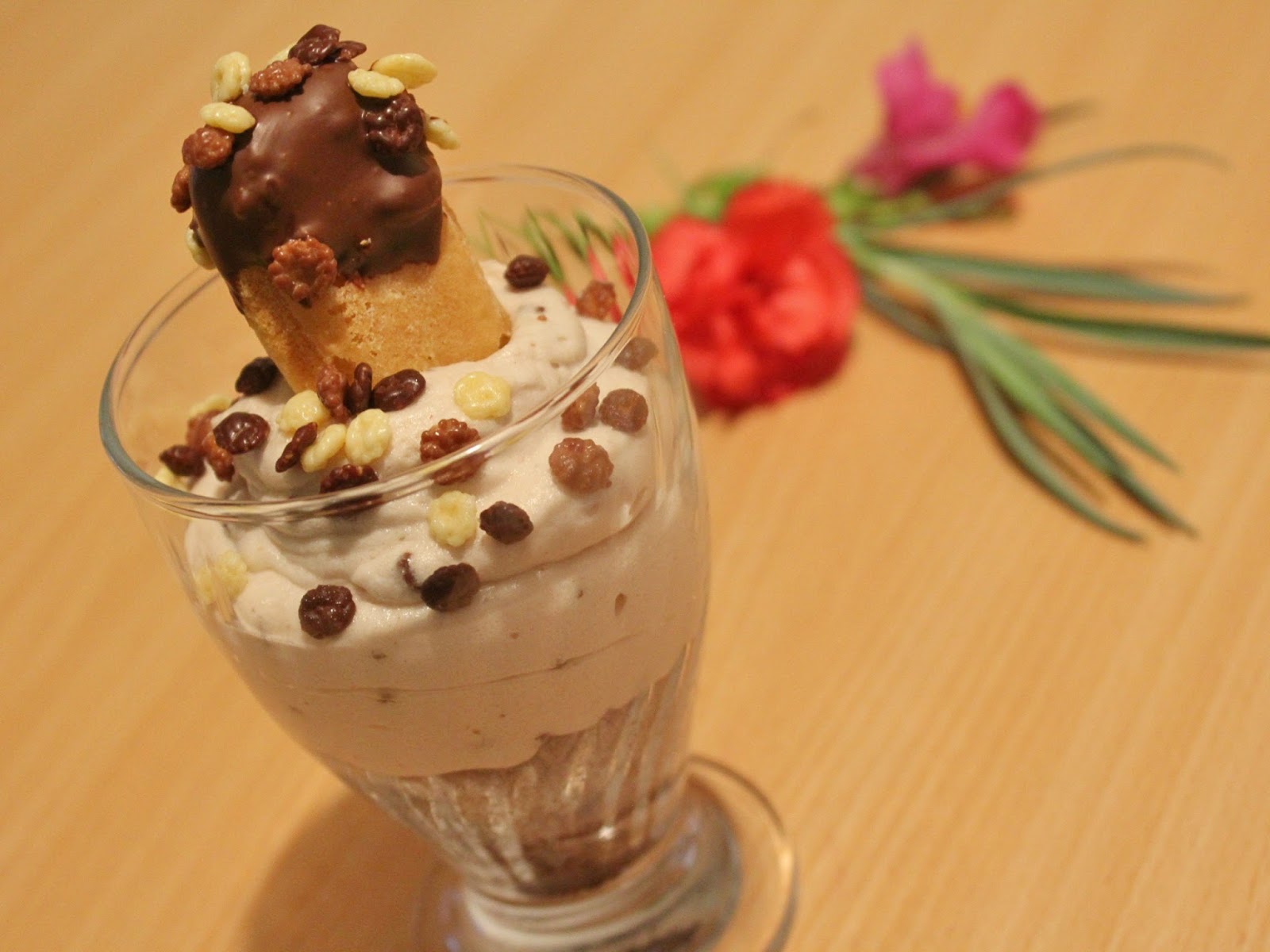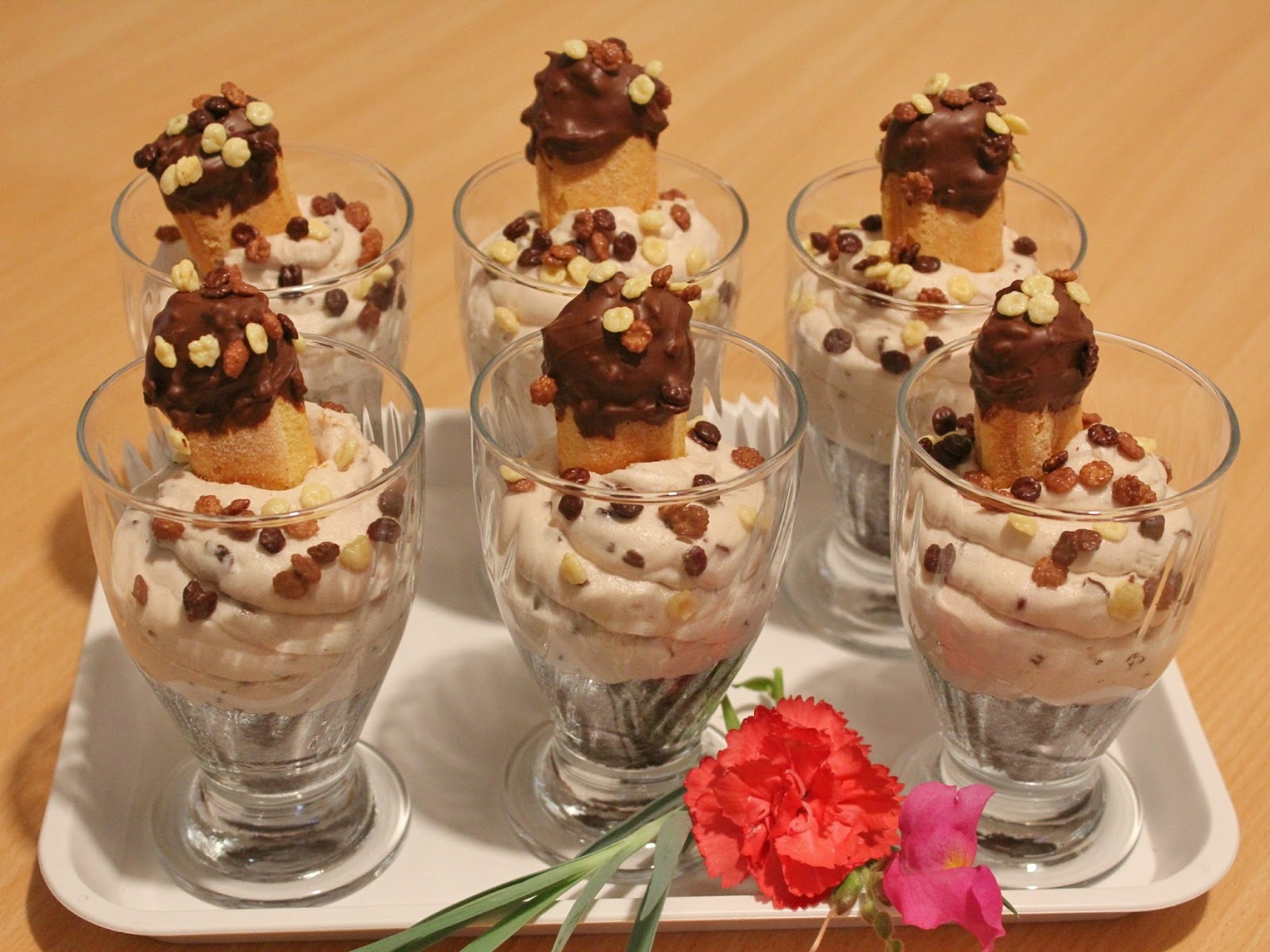 - Decorare con i savoiardi al cioccolato e con altro mini corn flakes e servire subito e tenere nel frigo fino al momento che si desidera, ma non per il giorno dopo, perché il savoiardo diventerà morbido stando nella crema.