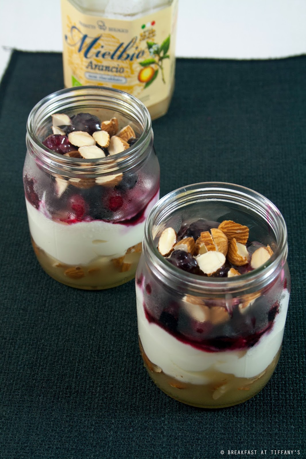 Mettere sul fondo di ogni bicchierino 2 cucchiai di miele, poi aggiungere un abbondante strato di yogurt greco, 1 cucchiaio di mandorle, aggiungere un altro cucchiaio di miele e decorare la superficie con i frutti di bosco e le mandorle tritate grossolanamente.