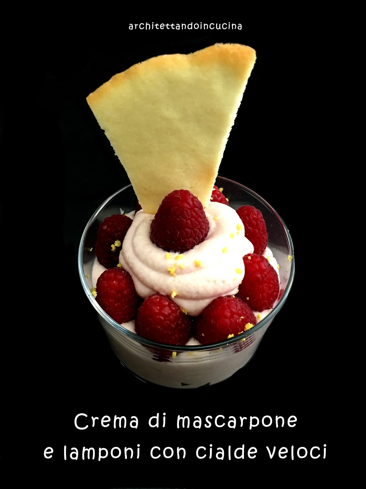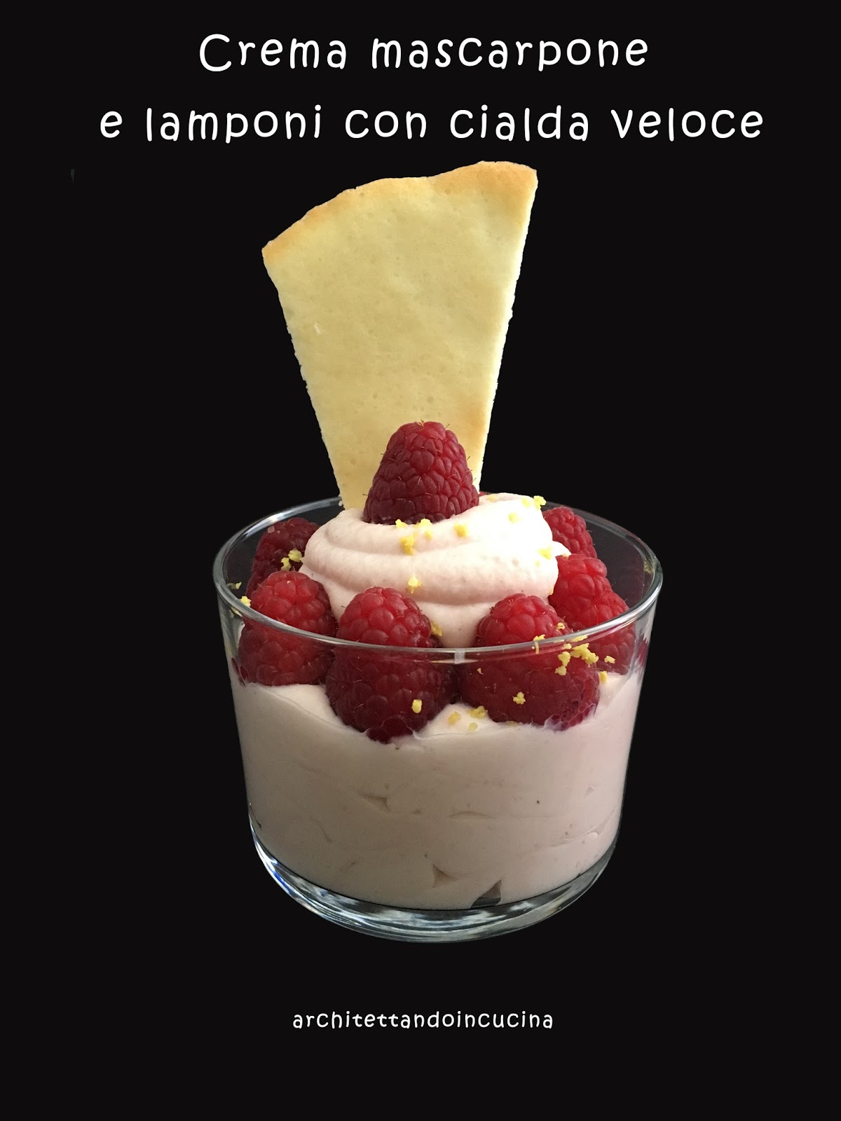 Inserire la crema in una sac a poche e riempire a 3/4 il bicchierino. Inserire i lamponi sopra, ricoprire il centro di crema e terminare con un lampone. Terminare con una grattugiata di scorza di limone ed una cialda.
