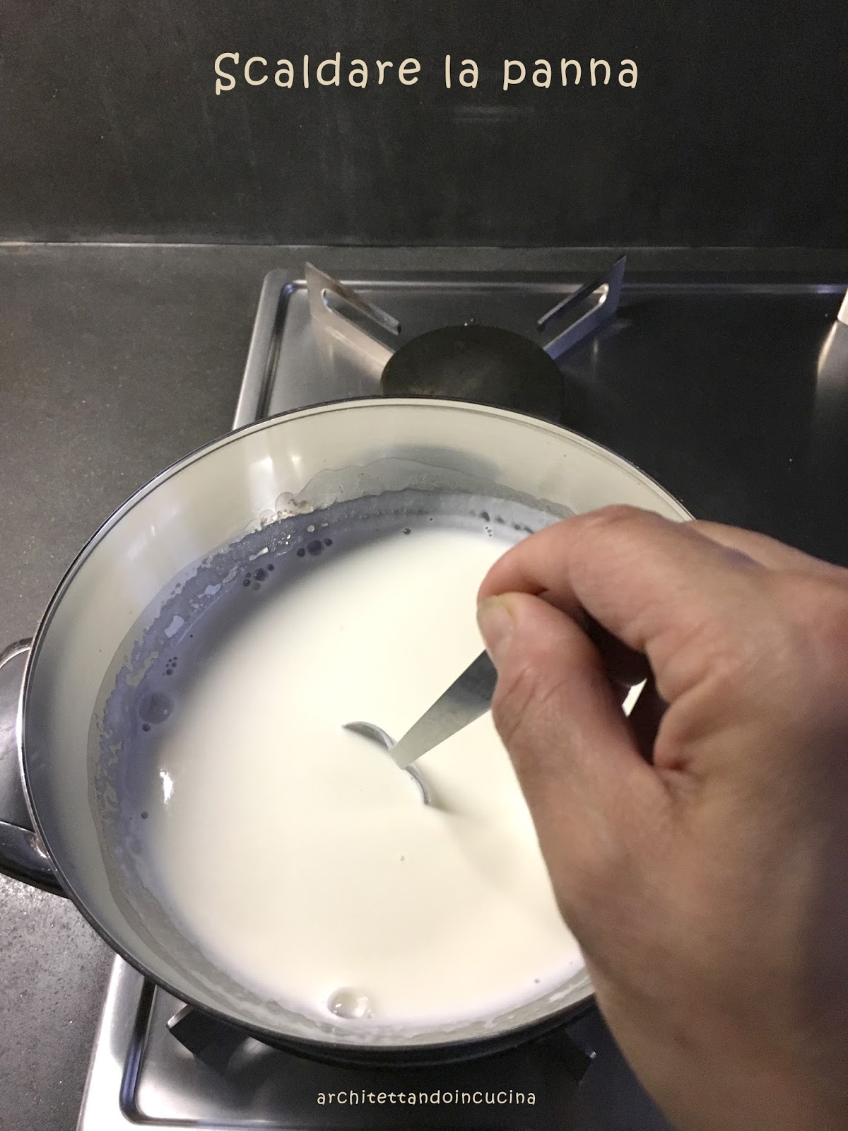 Versare la panna fresca in una ciotola di vetro o acciaio adatta per fare il bagno maria e poggiarla su una casseruola con 2 dita di acqua. Il contenitore superiore non deve entrare in contatto con l’acqua. Portare ad ebollizione l’acqua sottostante e misurare la temperatura nella ciotola superiore. Deve essere portata a 85°C.