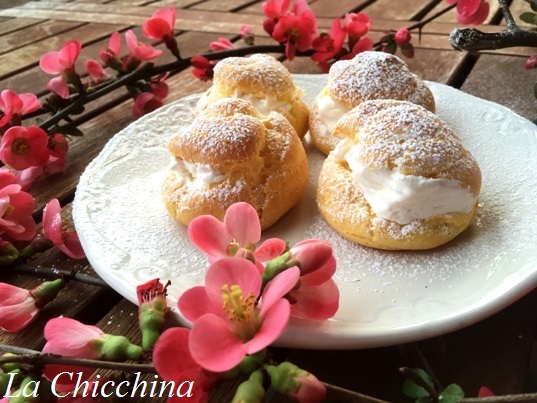 Con questa base si possono realizzare ricette sia dolci che salate ma noi, CHE NON SIAMO PER NULLA GOLOSI, inizieremo con dei bignè alla panna, che sono una delizia…