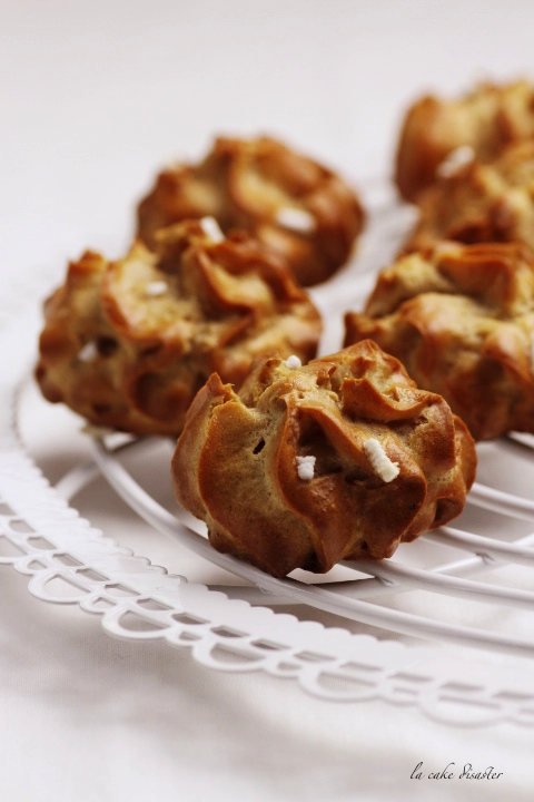 In una casseruola portare a bollore 200 ml di acqua e 50 ml di latte con il burro e la presa di sale, mescolare bene e lentamente, poi versare la farina di castagne (precedentemente setacciata) e mescolare sempre finché il composto non risulterà cotto (ve ne accorgerete perché si staccherà sfrigolando dalle pareti). Trasferire il composto in una ciotola e far intiepidire. Quando sarà tiepido incorporare le uova, uno per volta e aiutatevi con una frusta elettrica per ottenere un composto omogeneo e cremoso. Usando una tasca da pasticcere con una bocchetta a stella grande, distribuire il composto su una teglia da forno precedentemente ricoperta di carta da forno e formare circa 20 ciuffetti. Poi con le dita inumidite schiacciare leggermente le puntine sulla sommità. Cospargere i bignè con la granella di zucchero e poi infornare a 170° per circa 15minuti e poi a 150° per circa 25 minuti (forno elettrico ventilato), ogni tanto aprire il forno per far uscire il vapore. Infine sfornare i bignè e farli raffreddare completamente su una granella prima di farcirli. Io ho usato della semplice panna da montare che ho zuccherato a mio piacere. Ho tagliato a metà i bignè ormai raffreddati completamente e con l’aiuto di una tasca da pasticcere ho riempito i bignè di panna.