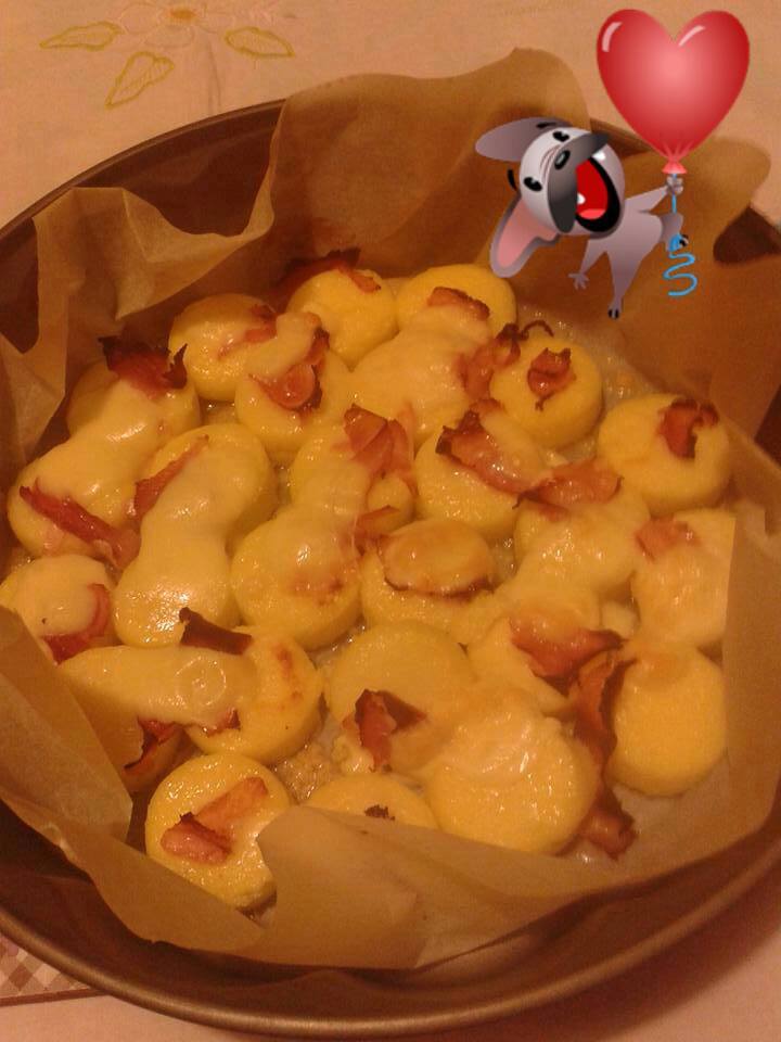 Quando si sarà raffreddato, tagliare dei dischetti utilizzando il misurino, disporli leggermente sovrapposti in una teglia da forno imburrata. Cospargere con fiocchetti di burro e parmigiano. Cuocere in forno preriscaldato a 200° per 20 min. circa.