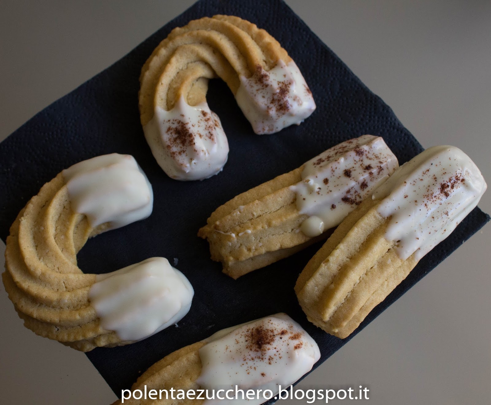 - Sciogliere a bagnomaria il cioccolato bianco e lasciarlo intiepidire. Intingere i biscotti ad una estremità e cospargere con un pizzico di cannella.
