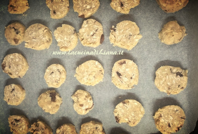 Dividere il burro a pezzetti, quindi lavorare con le mani la farina con il burro e lo zucchero, aggiungere il bicarbonato, il cioccolato in gocce e l’uvetta.