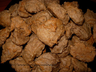 Preparare la tisana ai frutti di bosco e lasciarla raffreddare. Tritare banana e mandorle ed unire tutti gli altri ingredienti. Distribuire il composto ottenuto a cucchiaiate su una teglia con cartaforno. Cuocere a 180° per 20 minuti.