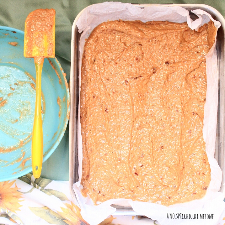 Ora lo stendete in una teglia rivestita da carta da forno e lo livellate bene sempre aiutandovi con la paletta di silicone.
