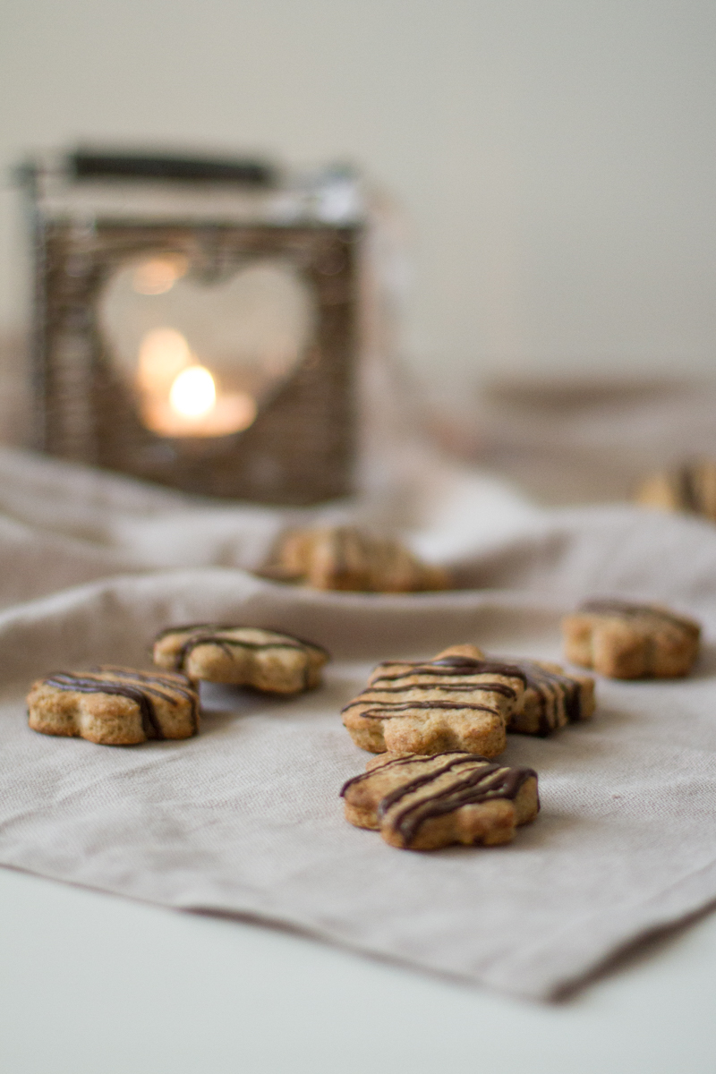 Nel frattempo, sciogliete il cioccolato dolcemente a bagnomaria e quando si sarà intiepidito, con un sac – à – poche, decorate a piacere la superficie dei biscottini, anche loro precedentemente raffreddati su una gratella.