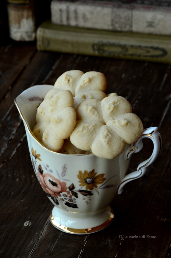 In una ciotola montate, con l’ausilio delle fruste elettriche, il burro morbido con lo zucchero, quando avrete ottenuto una massa soffice, aggiungete i semi della bacca di vaniglia, la scorza di limone, la fecola e montate ancora. Quando gli ingredienti saranno ben amalgamati, sciogliete il sale nel latte ed uniteli all’impasto. Seguitate unendo, poco per volta, la farina setacciata con l’accortezza di mantenere bassa la velocità delle fruste. Versate l’impasto ottenuto in un sac a poche, oppure se preferite nella spara biscotti. Io ho utilizzato quest’ultima. Quindi dopo aver scelto il dischetto o il beccuccio che preferite, formate i vostri biscotti. Io avendo usato la sparabiscotti, li ho “sparati” direttamente sulla teglia del forno senza preventivamente ungerla e senza carta da forno, in questo modo infatti i biscotti aderiranno meglio e non si attaccheranno. Una volta formati tutti i biscotti, metteteli 5 minuti in frigorifero prima di infornarli, manterranno meglio la forma. Cuocete, in forno già caldo, a 170° per circa 12 minuti, facendo attenzione che non si scuriscano troppo. Se volete, prima di infornare, potrete decorare i biscotti con un pezzettino di frutta candita o di frutta secca o anche con una puntina di confettura. Una volta freddi potrete conservarli, nella classica scatola di latta, per 8/10 giorni.