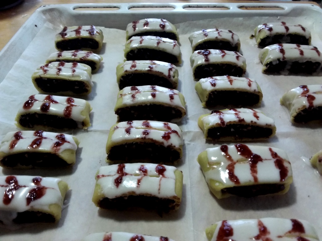 - Al momento di confezionare i biscotti, estrarre la pasta frolla dal frigo, batterla col mattarello e rilavorarla appena per ridarle plasticità, poi stenderla piuttosto sottile (2/3 mm), in due rettangoli allungati di 13/14 cm di larghezza. Al centro porvi una striscia di ripieno.