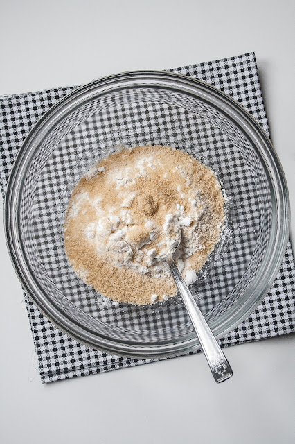 In una ciotola versate tutti gli ingredienti secchi: la farina 00, la farina di tipo 2, la fecola di patate, lo zucchero di canna e il lievito.
