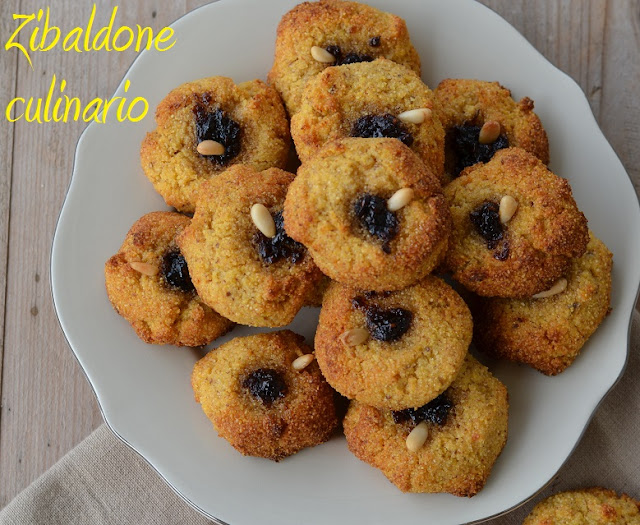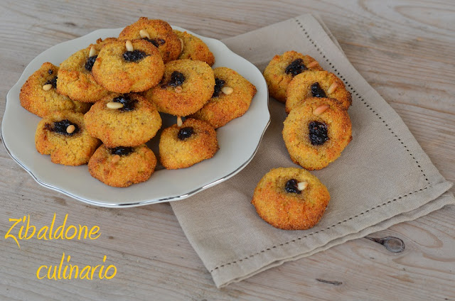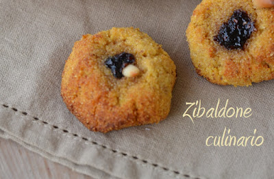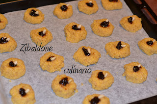 Con un cucchiaino (mi raccomando piccole quantità), posizionarlo su carta forno, un poco distanziate, con un dito fare una fossetta al centro, che verrà riempita con la composta e decorata con qualche pinolo.