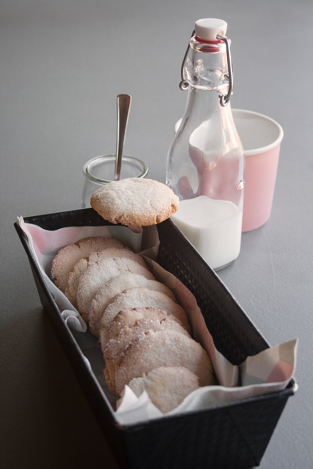 Una volta trascorso il tempo di riposo dell’impasto, formate i biscotti a mano, appiattiteli e passateli in superficie nello zucchero.