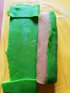 Ora parliamo della la parte bianca e di seguito verde: lavorare un poco la frolla e stendere con il matterello un rettangolo che abbia dimensioni adeguate per avvolgere il cilindro rosso.