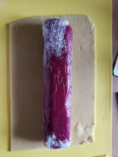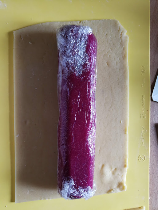 Ora estrarre la massa ottenuta e con la frolla rossa formare un cilindretto, così è già in forma per l’assemblaggio dei biscotti.