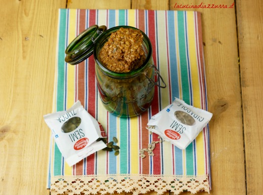 - Sciogliete il bicarbonato nell’acqua dopodiché aggiungetela agli ingredienti sciolti in Magimix e unite i semi e la farina (Esperto 2 minuti Vel.2A 0°C)
