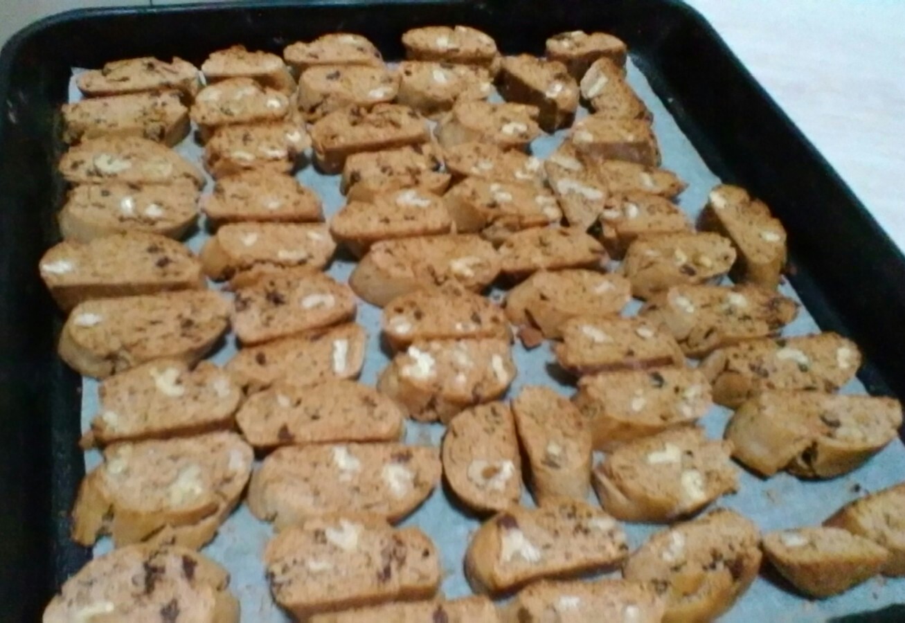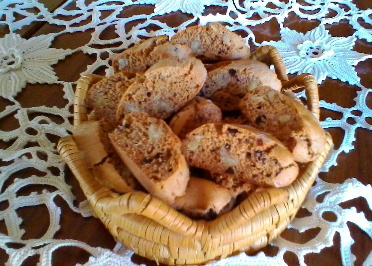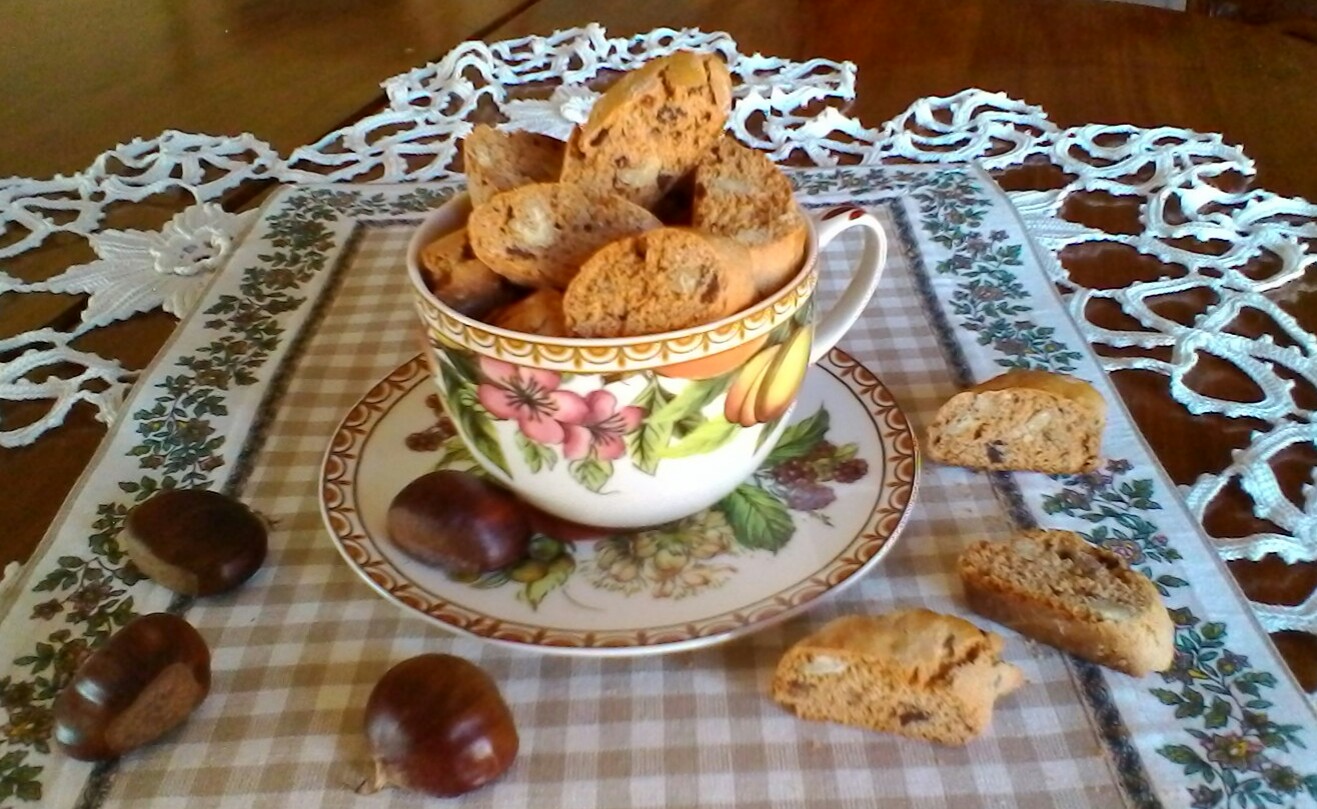 Questi biscottini sono una rivisitazione dei più famosi cantucci: in questa ricetta è stata aggiunta la farina di castagne e le mandorle sono tate sostituite dalle noci. In questo modo i biscottini indossano un vestito autunnale reso ancora più sfizioso dalle gocce di cioccolato che ben si sposano con il sapore dolciastro della farina di castagne.
