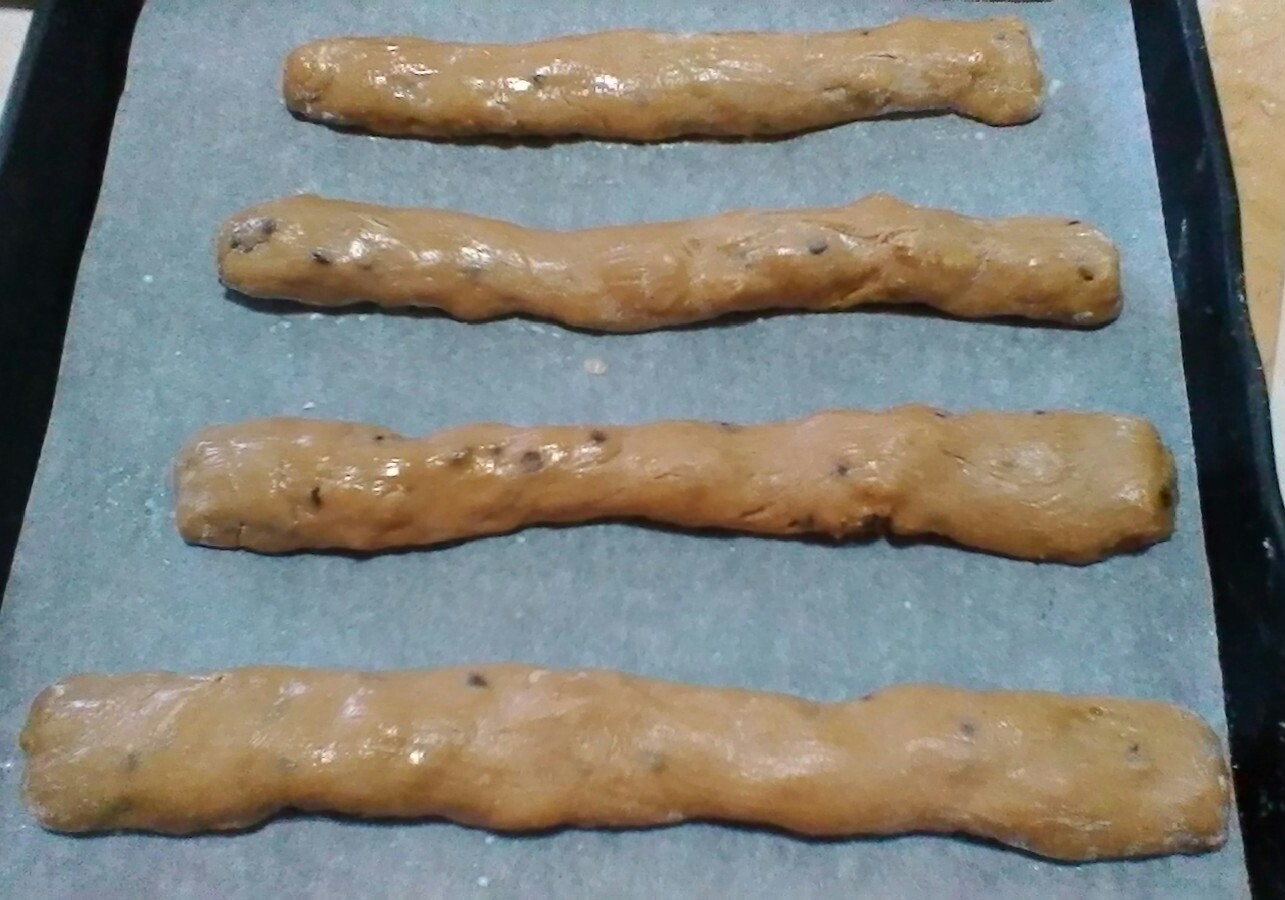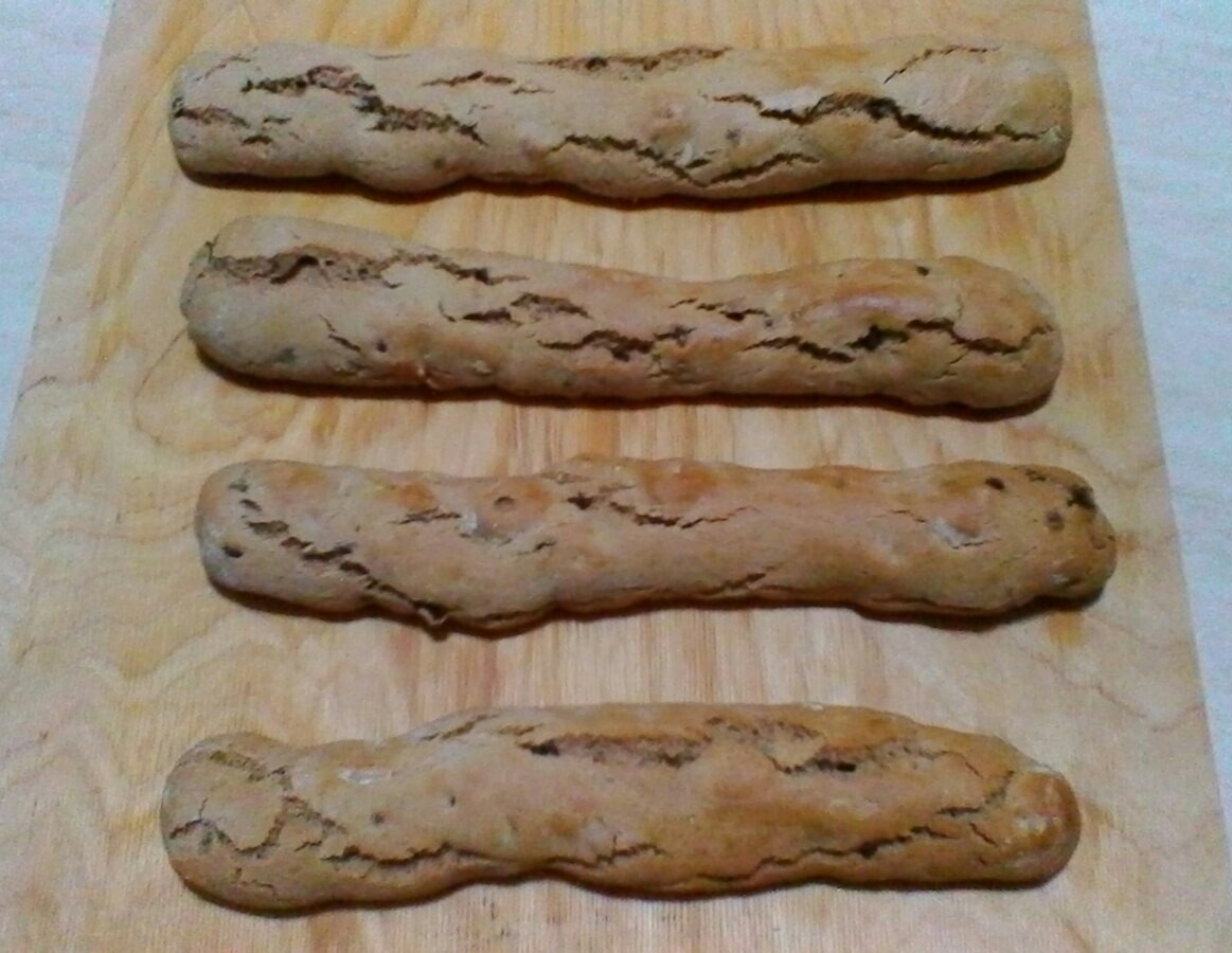 L’impasto risulta abbastanza appiccicoso perciò sporcatevi la mani con la farina. Spennellate i filoncini con del latte e infornateli a 180° per 20 minuti circa. Una volta cotti e con delle belle crepe sulla superficie fateli intiepidire e quindi tagliateli a fette obblique. Rimetteteli nel forno a 170° per 5 minuti a biscottare.