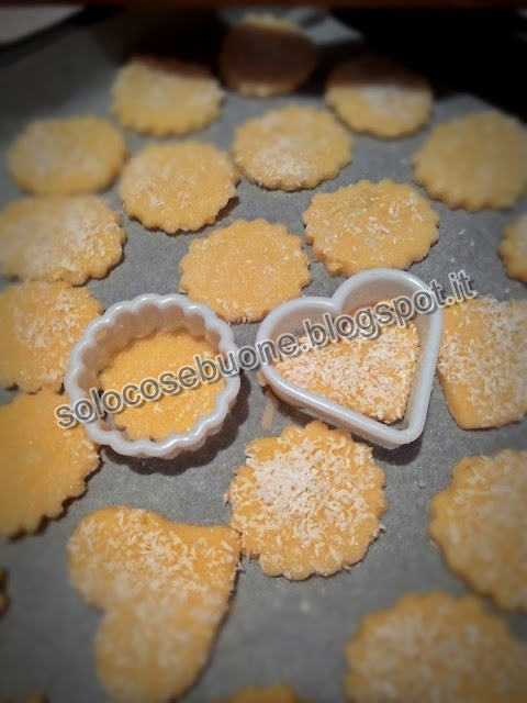 Bagniamo la superficie dei biscotti con un poco di acqua e ricopriamoli con zucchero e cocco grattugiato. Disponiamoli su carta forno e cuociamo in forno preriscaldato a 180° per 15 minuti o fino a quando diventano leggermente dorati.