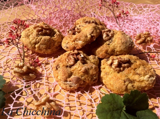 Vado in cucina e vedo quello che ho: delle noci così belle ce le mettiamo?! CERTO. L’uvetta piacerà?! Perché no! E la pera ci sta?! OVVIO… E allora sono NATI questi biscotti davvero buonissimi…