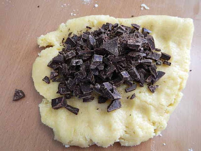 basta lavorarlo con le mani per un minuto per compattare l’impasto, a questo punto schiacciarlo un pò e inserire il cioccolato nell’impasto.