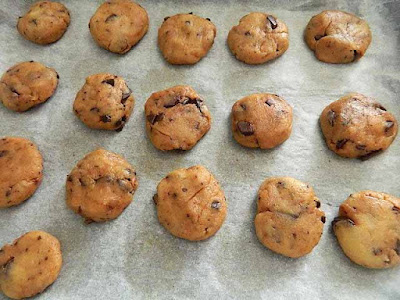 Staccare dei pezzettini dall’impasto e formare delle palline, schiacciarle un pò e metterle sulla placca da forno foderata con la carta.