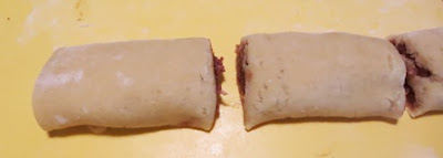 Arrotolare la pasta frolla fin quando si riesce a racchiudere per bene la farcitura avendo cura di inumidire leggermente il punto di giunzione e tagliare a pezzetti regolari…