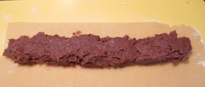Stendere ora la pasta frolla allo spessore di pochi millimetri e dispore una specie di salsicciotto come appare in foto..