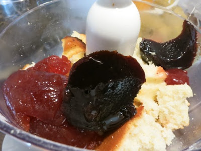 Porre nel boccale del mixer la torta o gli avanzi di biscotti, pan di Spagna o quello che si ha in casa e aggiungere la marmellata ..