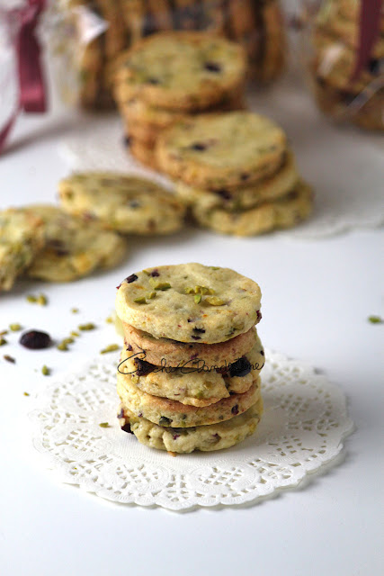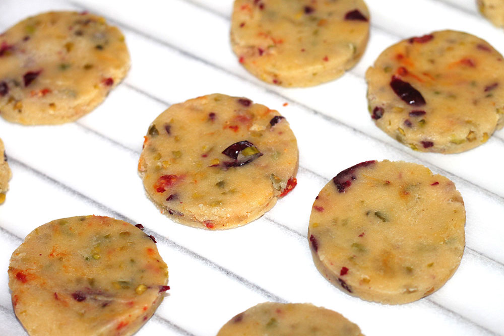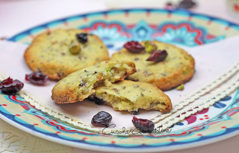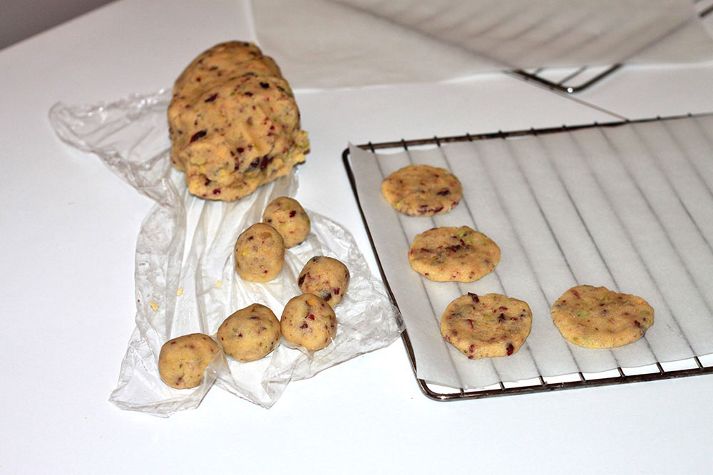 L’idea ce l’ha data un sito americano. Noi abbiamo fatto nostra la ricetta utilizzando una miscela di farine che hanno reso questi biscotti con frutti rossi, pistacchi e zenzero candito una vera bomba. Di bontà e… calorica.