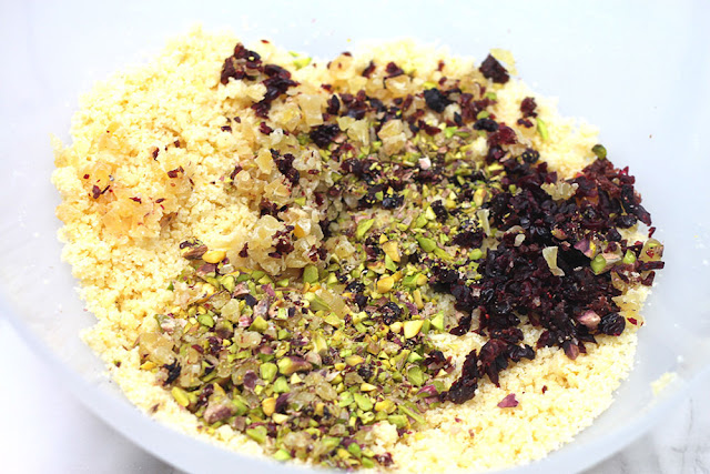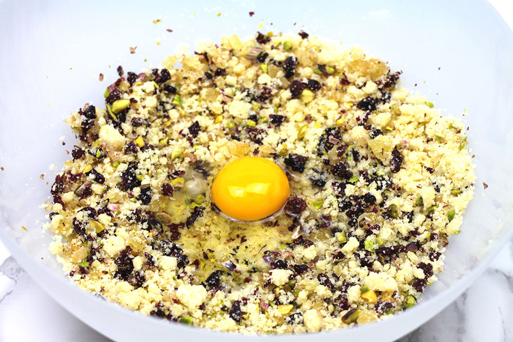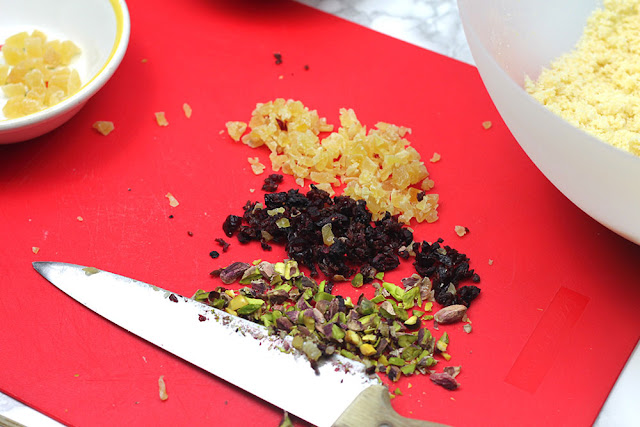 Tritate a coltello, grossolanamente, i pistacchi, lo zenzero e i frutti rossi. Non fate questa operazione col robot da cucina perché non serve una poltiglia di ripieno, ma tutti i vari ingredienti si devono sentire bene sotto i denti!