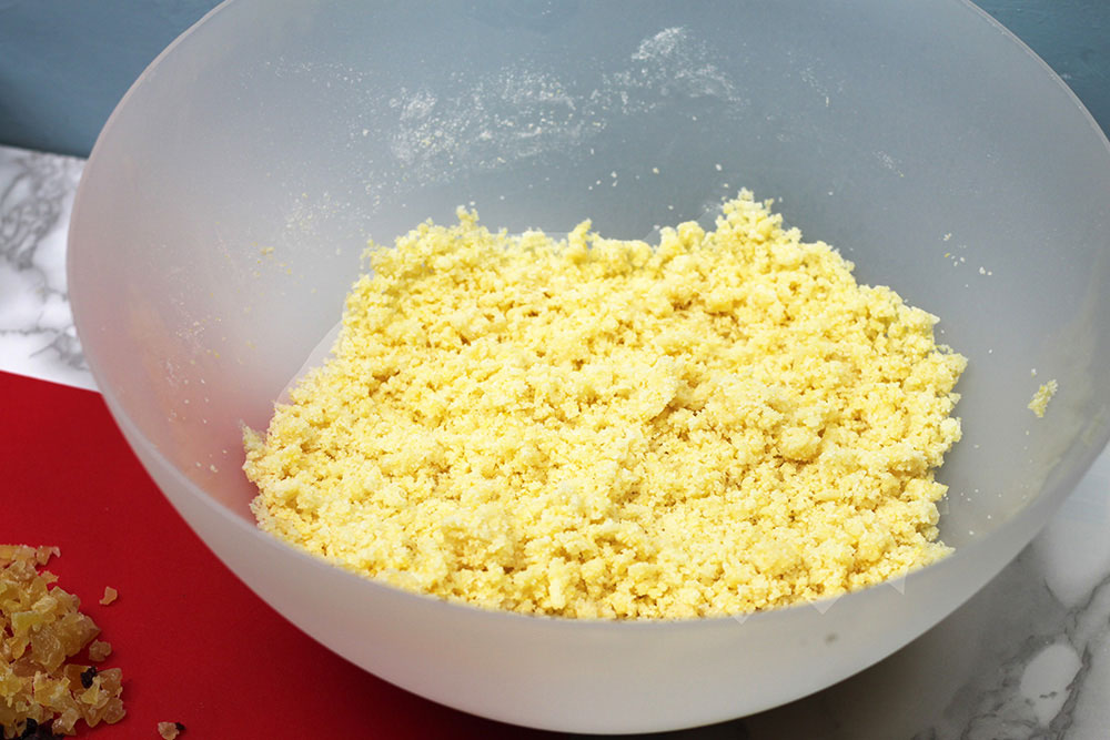 In una ciotola larga mettete la farina, lo zucchero, il lievito e il burro ammorbidito, ridotto a tocchetti. Lavorare con le mani fino ad ottenere una specie di “sabbia”.