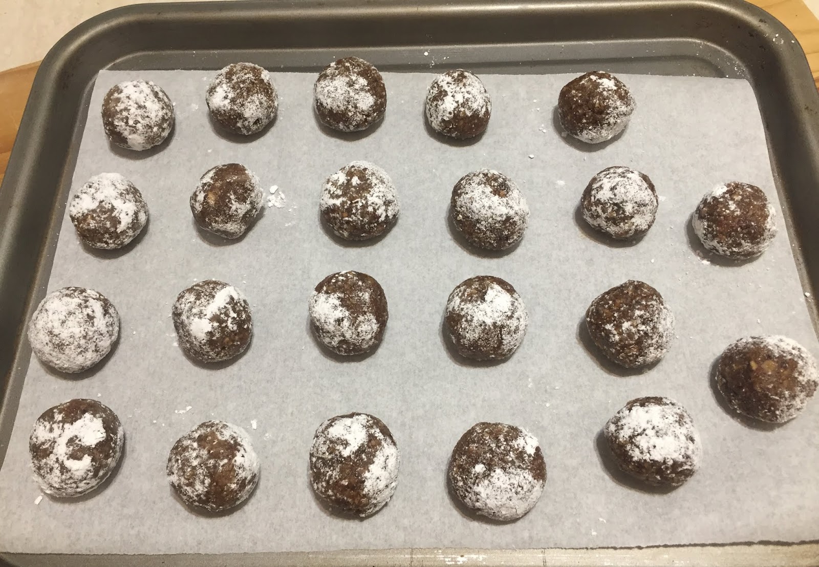 Tritate finemente le nocciole e le noci. Sbattete leggermente gli albumi. Versate in una ciotola la frutta secca, il caffè liquido e in polvere, lo zucchero, gli albumi e il lievito. Impastate per pochi secondi fino ad ottenere un composto omogeneo e compatto. Avvolgetelo nella pellicola trasparente e tenetelo in frigo per un paio d’ore (io tutto il pomeriggio). Trascorso il tempo formate delle palline, grandi quanto una noce e passatele prima nello zucchero semolato e poi in quello a velo.