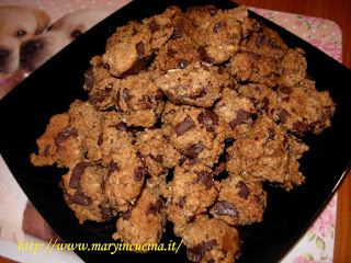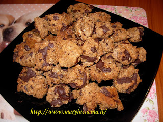 Tritare le mandorle con il macinacaffè così da ottenere una farina. In una ciotola raccogliere le due farine, lo zucchero ed il cioccolato tagliato finemente. Aggiungere acqua ed olio ed impastare bene amalgamando tutti gli ingredienti. Distribuire i biscotti su una teglia con cartaforno e cuocerli a 180° per 30 minuti.
