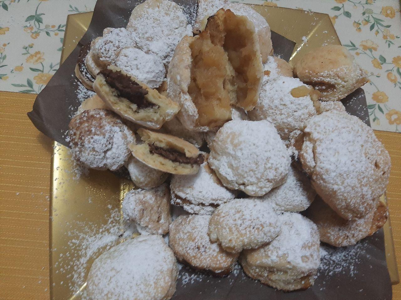 Con un cucchiaio disponiamo un po’ di ripieno alle mele su metà dei biscotti quindi sovrapponiamo un secondo disco di frolla e sigilliamo bene i bordi premendo con le dita per evitare la fuoriuscita del ripieno.