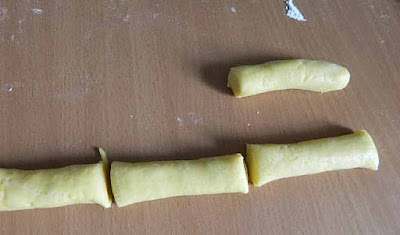 Non c’è burro quindi possiamo usarlo subito, trasferire l’impasto su un piano infarinato, staccare dei pezzi dall’impasto e realizzare un bastoncino dal quale taglieremo dei pezzetti di circa 8 cm.