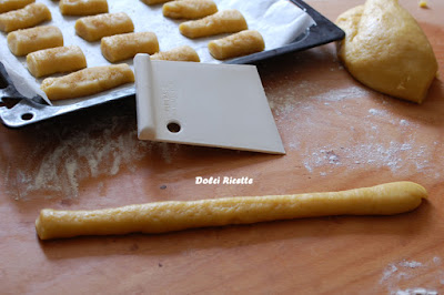 Una volta formato il panetto dividerlo in 4/5 parti e formare dei serpentelli non troppi fini e tagliare i biscotti della lunghezza che si desidera. Io non li ho fatti molto lunghi. Se volete potete mettere in superficie lo zucchero di canna.