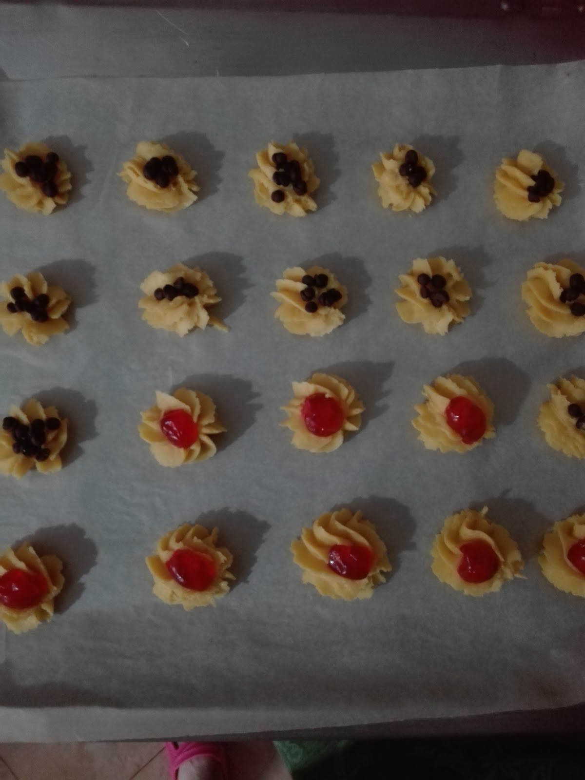 - Decorate i biscotti rimanenti mettendo mezza ciliegia candita al centro di ognuna e pressate leggermente, quindi infornate.