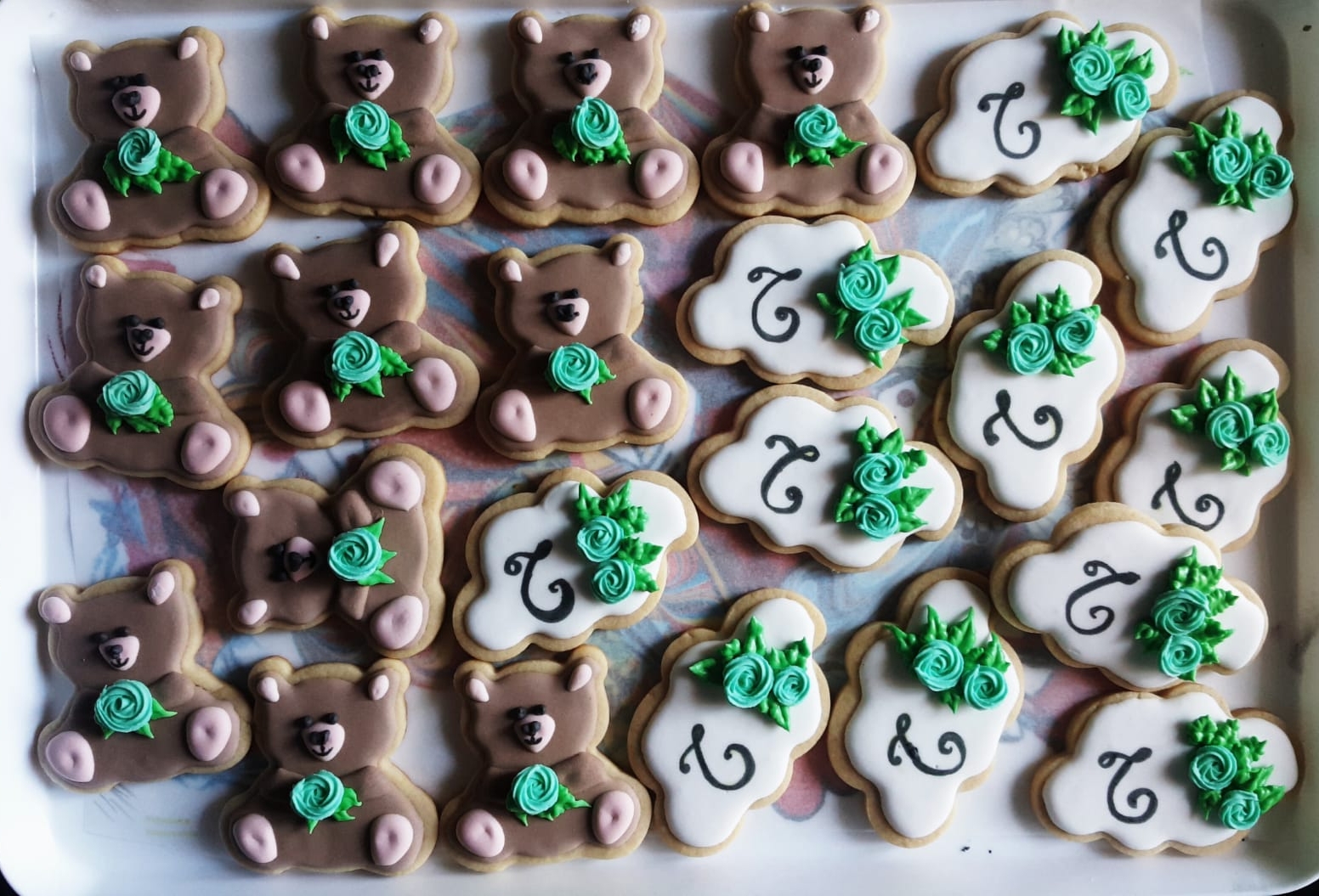 Non riesco quasi a crederci, è trascorso tutto questo tempo… tempo in cui i momenti da dedicare alla decorazione dei dolci sono stati quasi pari a zero. Lavoro full-time, Furbissima ormai alle porte dell’adolescenza, un compagno fantastico da due anni, casa da gestire, ed è chiaro che al di là di qualche tortina, questo mondo zuccheroso è stato per forza di cose accantonato. Ma che succede? Arriva la pandemia, e con essa la cassa integrazione fissa da settembre. In estate qualcosa siamo riusciti a combinare (lavoro nel turismo), a tempo ridotto, ma con l’arrivo dell’autunno e, purtroppo, la situazione non rosea, sono completamente ferma. Il battesimo del piccolo Tommaso è stata l’occasione per rimettere le “mani in ghiaccia” con questi biscotti a forma di orsetto e nuvola con roselline a nastro. Temevo di aver perso la mano, di non riuscire più a creare una bella base uniforme, di non azzeccare la consistenza della ghiaccia, di non fare delle roselline decenti, ma alla fine ero soddisfatta del risultato: