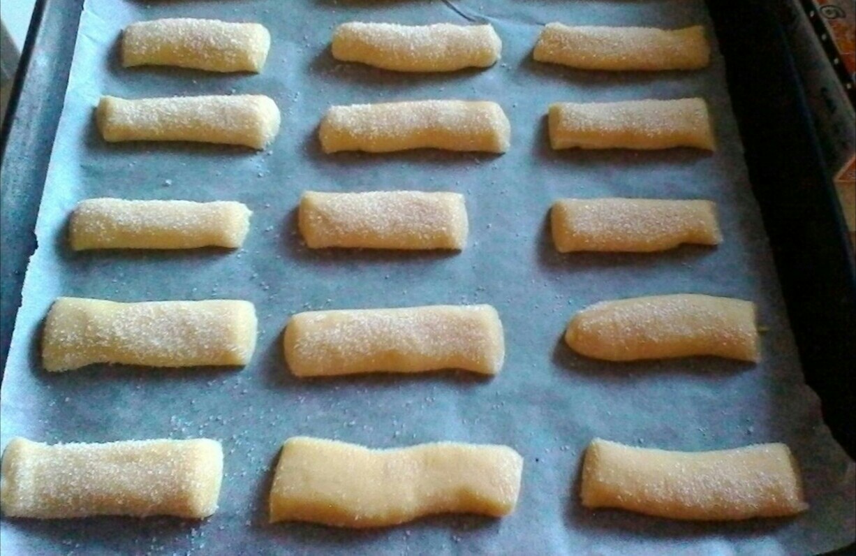 In una ciotola versate le uova e lo zucchero e lavorateli per alcuni minuti con le fruste. Aggiungete quindi il latte, l’olio di semi e sempre mescolando la farina setacciata con l’ammoniaca. Trasferite l’impasto su una spianatoia infarinata e impastatelo brevemente. L’impasto finale deve essere morbido e liscio. Ricavate dei cilindri più o meno della stessa grandezza, passateli nello zucchero soltanto da un lato e disponeteli, non troppo vicini, su una tortiera rivestita di carta forno.