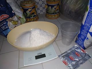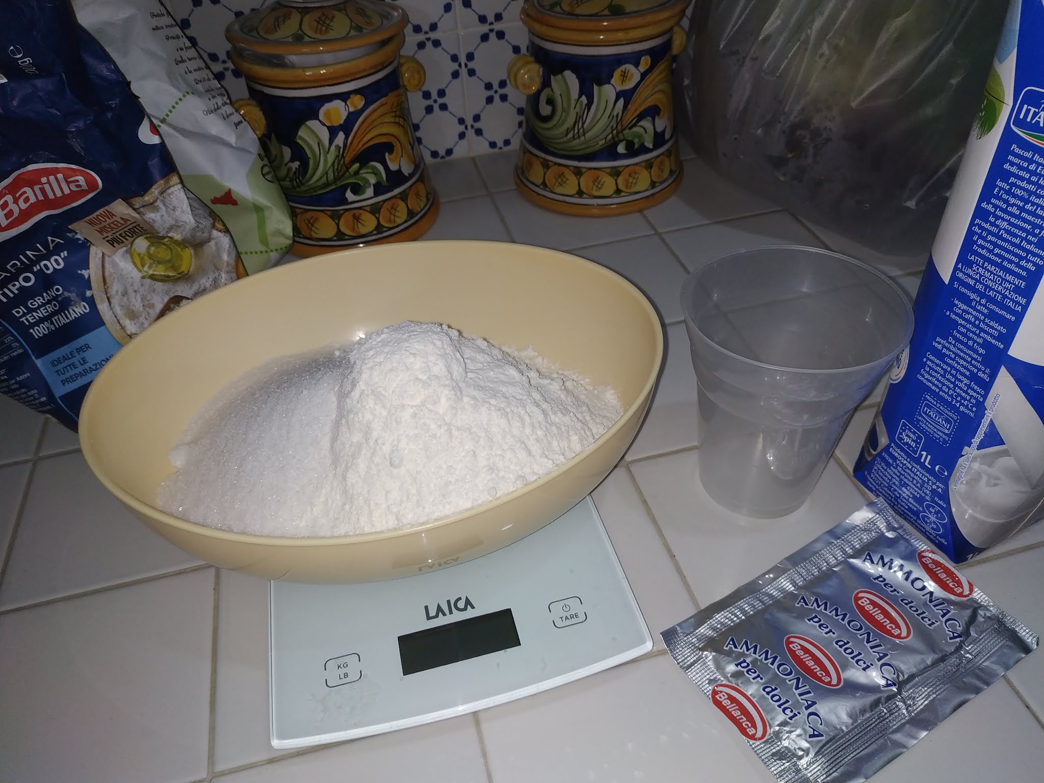 Ingredienti: impasto esterno 500 g di farina 00, 150 g di zucchero, 2 g di ammoniaca per dolci, 1 bustina di lievito per dolci, 150 g di strutto, latte quanto basta;