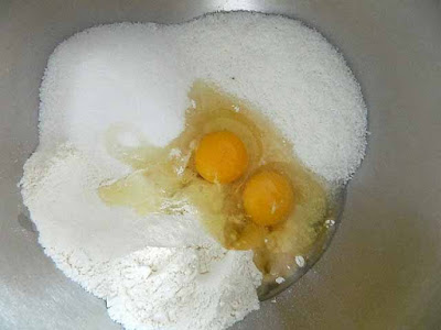 Nella ciotola della planetaria o sulla spianatoia mettere la farina, il cocco, lo zucchero, il lievito, l’olio e le uova.