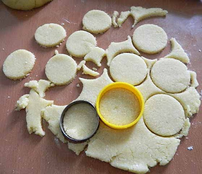stendere una sfoglia di circa mezzo cm di altezza, con un taglia-biscotti tondo ritagliare tante forme,
