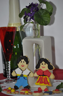 Ritagliare su un cartoncino le sagome di due bambini e riportatele sulla pasta; ricavate anche piccoli cuoricini o fiorellini. Infornate e controllate il forno perchè dovrete tirarli fuori prima che comincino a scurirsi. Siccome la frolla è sottile bastano pochi minuti. Fateli raffreddare.